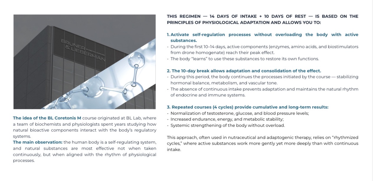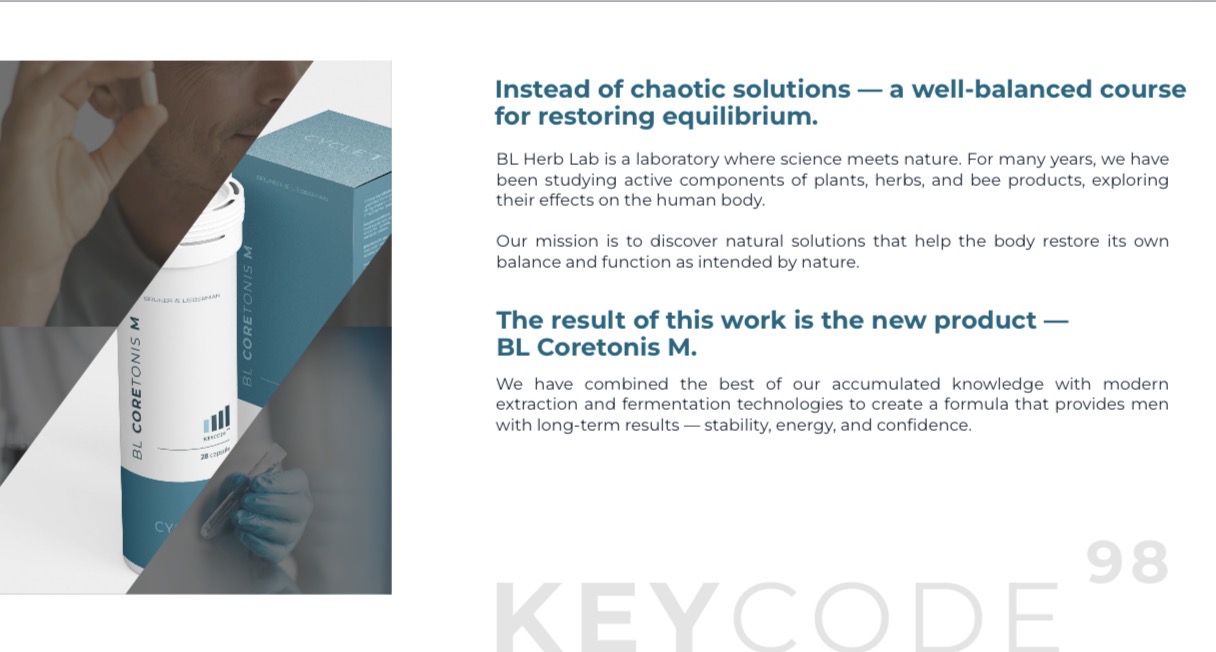 I would like to introduce you to BL Coretonis M by Bruner & Lieberman (BL Herb Lab) — a natural dietary supplement designed specifically for men, aimed at restoring the body’s internal balance.