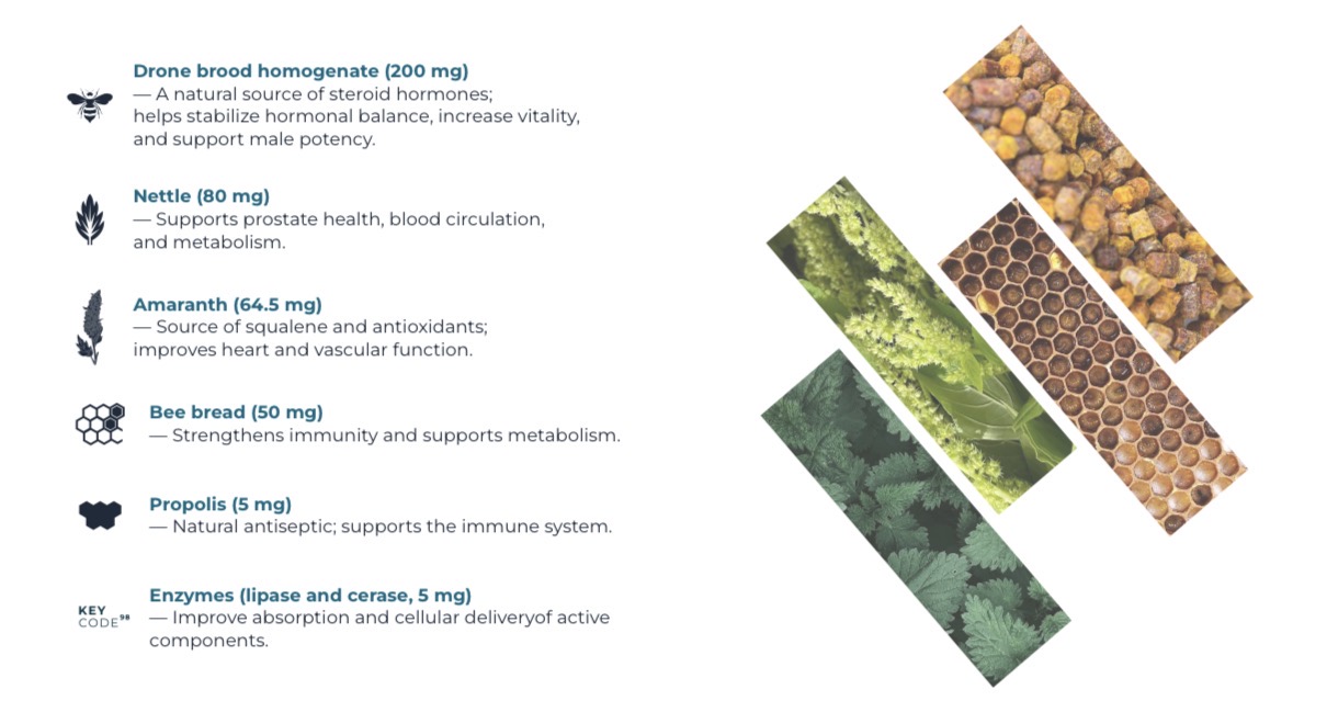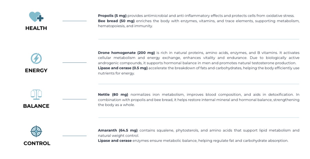The product is created in a laboratory where science meets nature — combining years of research into active plant, herbal, and bee-derived substances with advanced extraction and fermentation technologies. It’s an exclusive formulation with evidence-based synergy among its components.