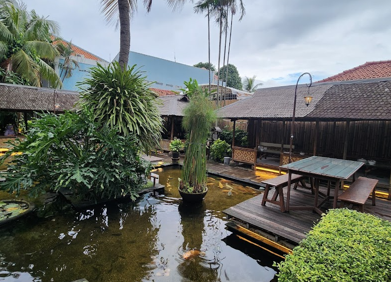 Rumah makan dengan suasana makan diluar seperti di pedesaan dengan kolam ikan hias yang luas. Cocok untuk makan bersama dengan teman kantor dan keluarga.