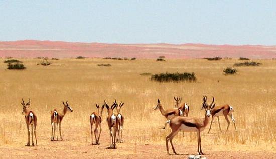 Namib Naukluft Lodge The best spot to experience the living desert is on our 13,000 ha farm, which was pronounced as a private nature reserve in 1999 and hosts the upmarket Namib Naukluft Lodge. Stunning sceneries invite you to nature drives and walks. Enjoy your stay in unexpected comfort and friendly hospitality. The Lodge offers a variety of activities and we recommend a stay of two to three full days. Enjoy the ever-changing pastel colors of the beautiful Pro-Namib. Use the morning hours for an easy climb to the top of one of the adjacent granite hills or a walk in the vicinity. Explore the diverse flora and fauna, where the trees grow seemingly out of the stones. Relax at the crystal clear swimming pool during the heat of the day. In the late afternoon you may join a 'sundowner' – drive to the natural marble mountains on the farm. Listen to the evening sound of the barking gecko – a concert never to be forgotten. The clear night sky invites you to an unreal stargazing experience. Try to spot the Milky Way and the Southern Cross! We'll show you the oldest desert on earth. Our friendly staff will make your stay unforgettable. Welcome to Namib Naukluft Lodge – your desert dream! Namib Naukluft Lodge offers 16 tastefully furnished rooms with en-suite facilities and a private, spacious patio with a striking view. Excellent traditional meals are served in the restaurant, on the adjacent verandah or in the boma by the open fire. The lounge and pool area offer a relaxed atmosphere after an active day in the desert. The Sossusvlei Excursion On a daily basis, an excursion to the popular dunes at Sossusvlei is offered. The tour is conducted by an Englishspeaking driver / guide in a 4 x 4 overland vehicle. Secure your seat and book in advance. An early morning rise, with a snack before leaving, enables you to arrive at Sesriem, the Park's gate, at around sunrise. Enjoy this unique desert scenery with some of the highest dunes in the world. The dynamic and star-shaped dunes are ideal for the keen photographer. Climb one of the over 300m high dunes and you will be overwhelmed by the view. A full breakfast is served under shady camelthorn trees. Visit the Sesriem Canyon before returning to the Lodge for lunch. The Naukluft Hiking Trail If you are fit and active, we offer a 2 hour hiking trail in the mountains of this 13,000 ha private nature reserve. Your hike will be accompanied by one of our nature conscious guides. However, you may also walk it by yourself. The trail is accurately laid out, a map and a radio will ensure your safety during the hike. Extend your Sossusvlei Shuttle for another day to experience the Naukluft Mountains – the other side of the desert !